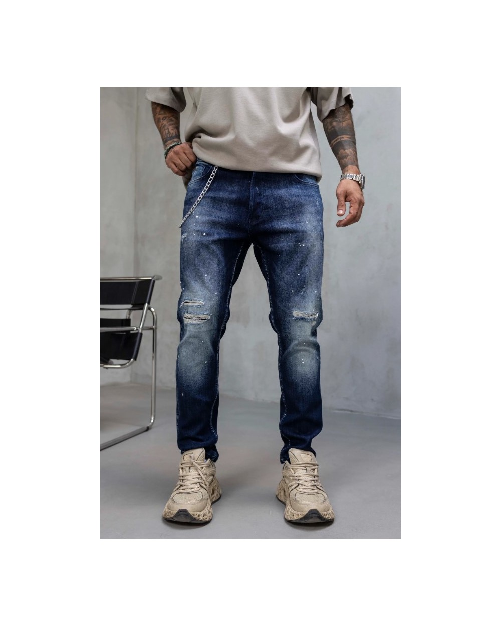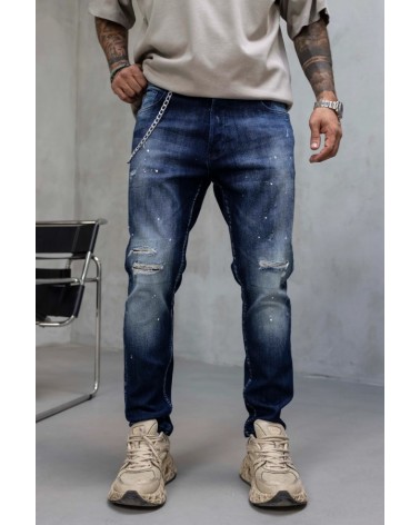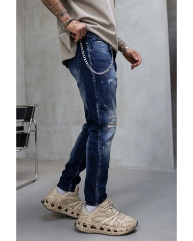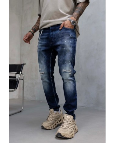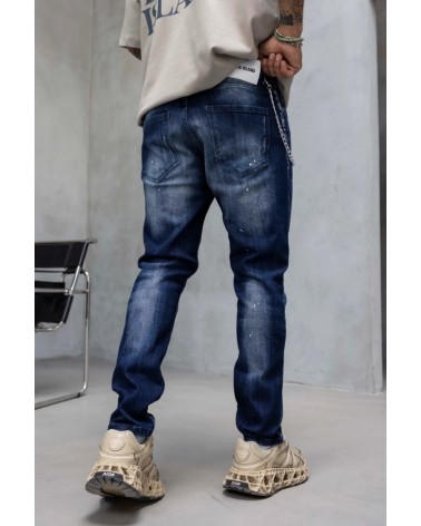 Vaqueros ajustados de mezclilla azul desgastada con detalles rasgados y salpicaduras de pintura aplicadas a mano, que aportan un estilo urbano y desenfadado. Su corte estilizado y tejido elástico ofrecen comodidad y libertad de movimiento, perfectos para Vaqueros ajustados de mezclilla azul desgastada con detalles rasgados y salpicaduras de pintura aplicadas a mano, que aportan un estilo urbano y desenfadado. Su corte estilizado y tejido elástico ofrecen comodidad y libertad de movimiento, perfectos para combinar con camisetas o sudaderas oversize y lograr un look moderno y con carácter.
