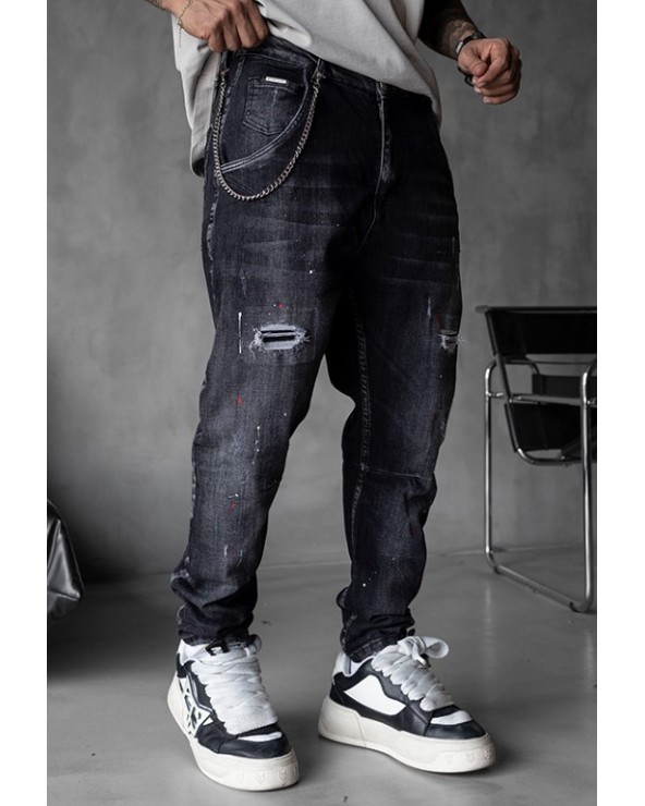 Dale un toque distintivo a tu look con estos jeans negros ajustados de efecto lavado, con rodillas rasgadas y llamativas salpicaduras de pintura...